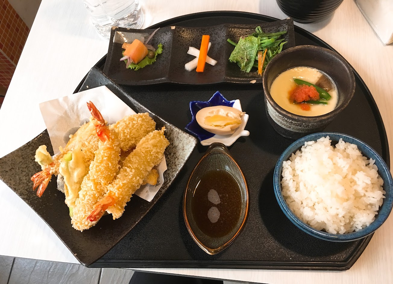 炸蝦天婦羅定食不錯~還有附上小小的生魚片,茶碗蒸也有些魚卵,很精緻。