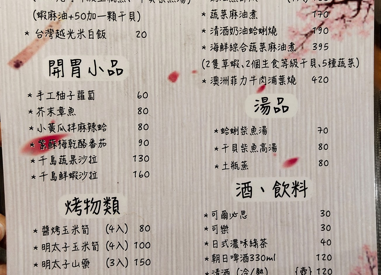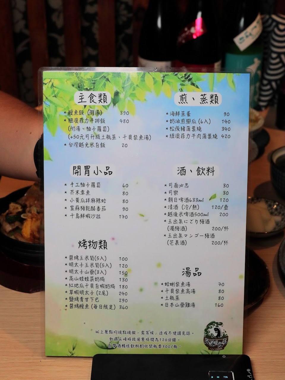 推薦:鰻魚飯、芥末章魚、茶碗蒸、一夜干、明太子玉米筍、乳酪番茄(全名忘記了⋯⋯)
