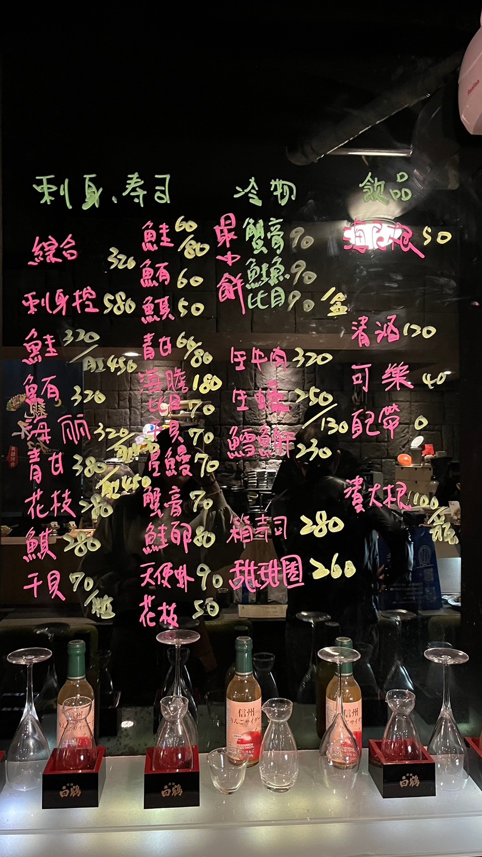 低消是一個人一個套餐,有含沙拉、味增湯、茶碗蒸,除了菜單上的餐點以外,還有當日黑板菜色,推薦點限量套餐,愛吃鬼恩恩丼是滿滿的綜合刺身,有干貝.鮪魚.鮭魚.蟹膏.魚卵等等。女朋友套餐有當日的烤魚.烤蝦.炙比目魚握壽司.星鰻壽司.牛肉壽司.炙鮭魚起司壽司!