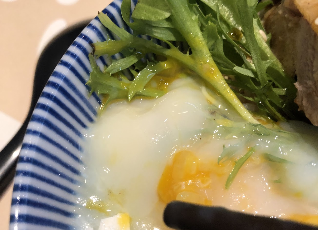 非常普通的餐點,雙拼肉六片,溫泉蛋冰的,已取消味增湯,白飯,高麗菜續用