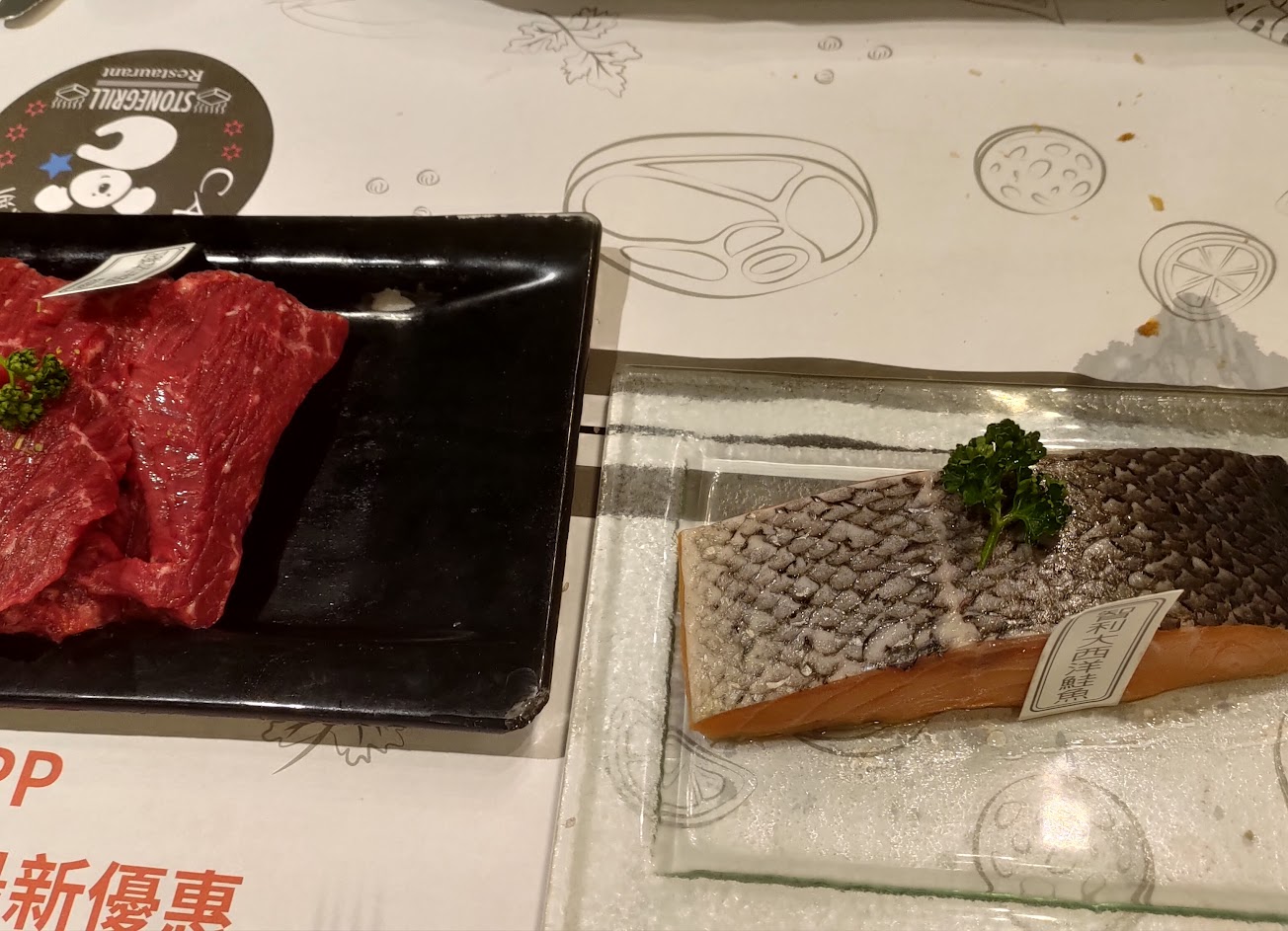 然而主餐開始完全不行,一開始店員就把所有肉及海鮮全部放上石板,石板本身就無法像直火一樣熱,一次全放上他降溫更快,而且店員全部先煎過表面(實際上石板根本煎不出焦化的顏色及香氣),後面又讓客人自己烤,熟度非常難掌控,基本上全部都過老相當乾柴,而且多種食材味道混雜在石板上,旁邊附的蔬菜因溫度不夠加味道混雜,根本沒辦法放上去烤,最後只能吃冰的