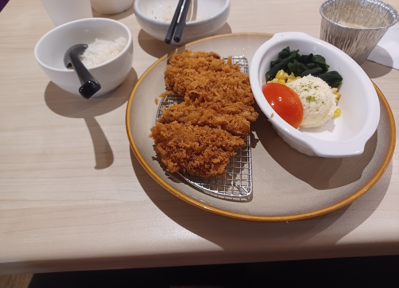 臨時起意,來到這裡。店員告知現點現做,所以可能需要時間等待,越光米白飯(好吃),湯(有兩種,大醬湯與雞清湯,另外海帶芽,蔥花,薑絲,豆芽洋蔥的配料),小菜(基本的高麗菜絲,黃豆芽泡菜與醋醃大根)還有軟性飲料都能自助取用。餐點分套餐(有蒸蛋與炸薯條)或單點(自助吧一樣可以取用)炸豬排外皮酥脆,內軟嫩,炸牛排比較平淡,可以搭咖哩或起士享用,唐揚雞是採薄粉炸,所以可以吃到酥香雞皮。炸類與小菜都不錯,如果單純想吃白飯配炸豬排或炸牛排,價格實惠,這裡可以推。