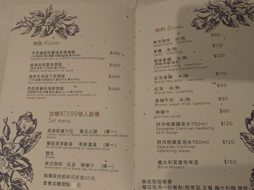 店內的擺設很令人感到舒服,服務員的態度也很好,只是餐點的部分價錢稍微高了一點,主打義大利麵,所以菜單上的燉飯種類只有三種,對於喜歡吃燉飯的客人來說選擇很少,覺得是很可惜的。