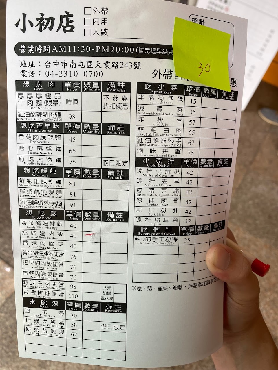 服務人員建議隔天0900就可以電話訂餐外帶
