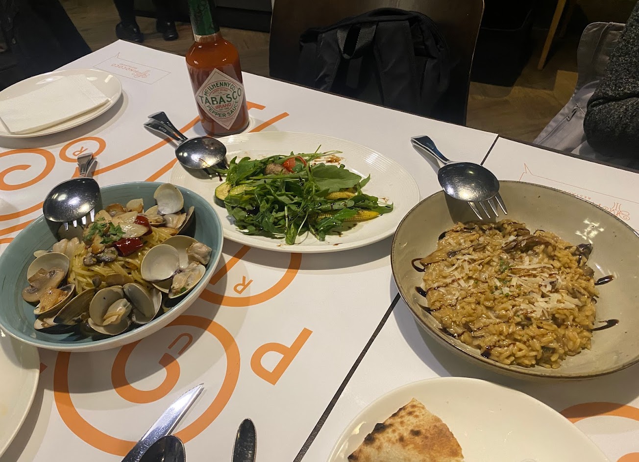 2023.01.15 兩週前訂的晚上5:30位子,準時報到後入場時已經有多桌客人入座。入座後服務人員先詢問喝瓶裝水(氣泡水)還是一般開水。接著介紹菜單還有黑板上面的”今日特色菜單”,我們3人點了 酥炸軟絲/吉拉朵No.2生蠔(一個)/白酒蛤蜊細扁麵/9”松露野菇披薩/提拉米蘇/黃檸檬漾/美式咖啡。酥炸軟絲炸得恰到好處,非常好吃。白酒蛤蜊義大利麵的蛤蜊也不錯,細扁麵非常有彈性。披薩也非常好吃,餅皮也非常Q彈不像一般的脆硬。提拉米蘇也好吃,酒味夠又不過份。黃檸檬漾也非常濃郁好喝。比較可惜的是美式咖啡杯太過一般,與用餐環境不搭配。用餐環境裝潢好,用餐客人多但還好不吵雜。整體來說價格還ok,餐點非常好,值得推薦。