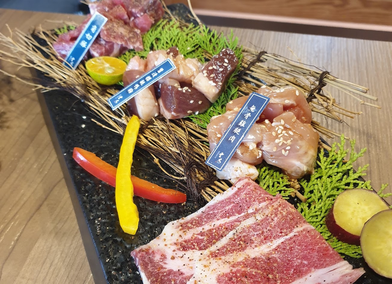 2. 食材品質尚可,但是都還蠻新鮮的。(肉有調味醃漬過,味道還不錯;肉的種類盛盤時,有些種類會有小名牌讓客人瞭解肉種)