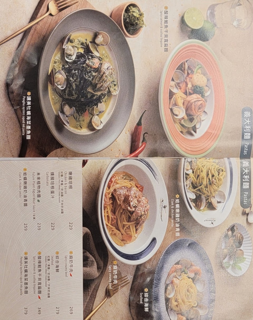 義麵:蛤蜊嫩雞奶油青醬/燻腸培根蛋汁麵:
