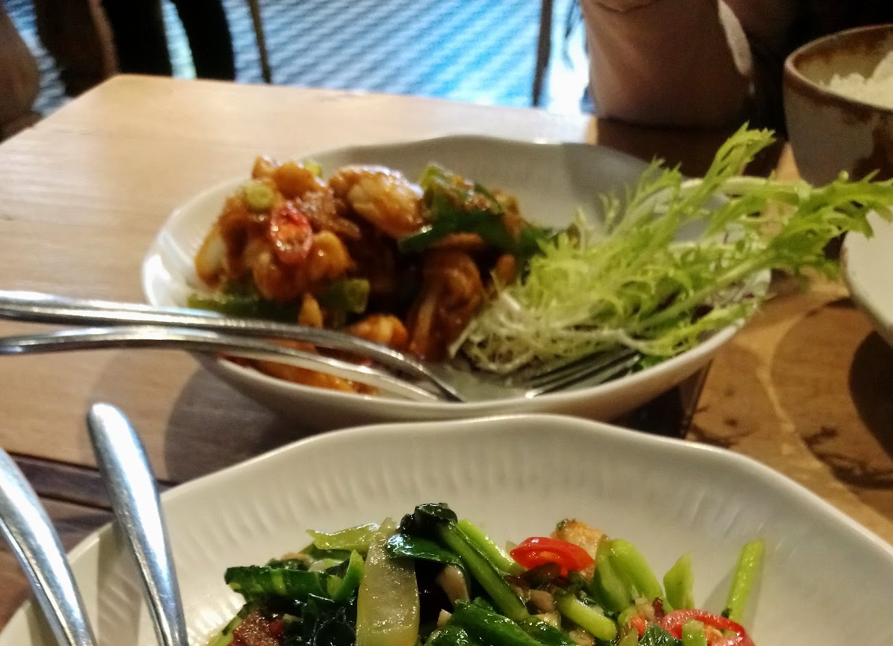 整體來說價格偏高,金錢蝦餅肉的比例比蝦還要多,涼拌海鮮服務人員說海鮮很多,我一點都感覺不出來,蔬菜量很多倒是真的,辣炒空心菜及鹹蛋黃炒中卷味道夠重並沒有失望,打拋豬普普通通,只能說裝潢勝過於餐點。