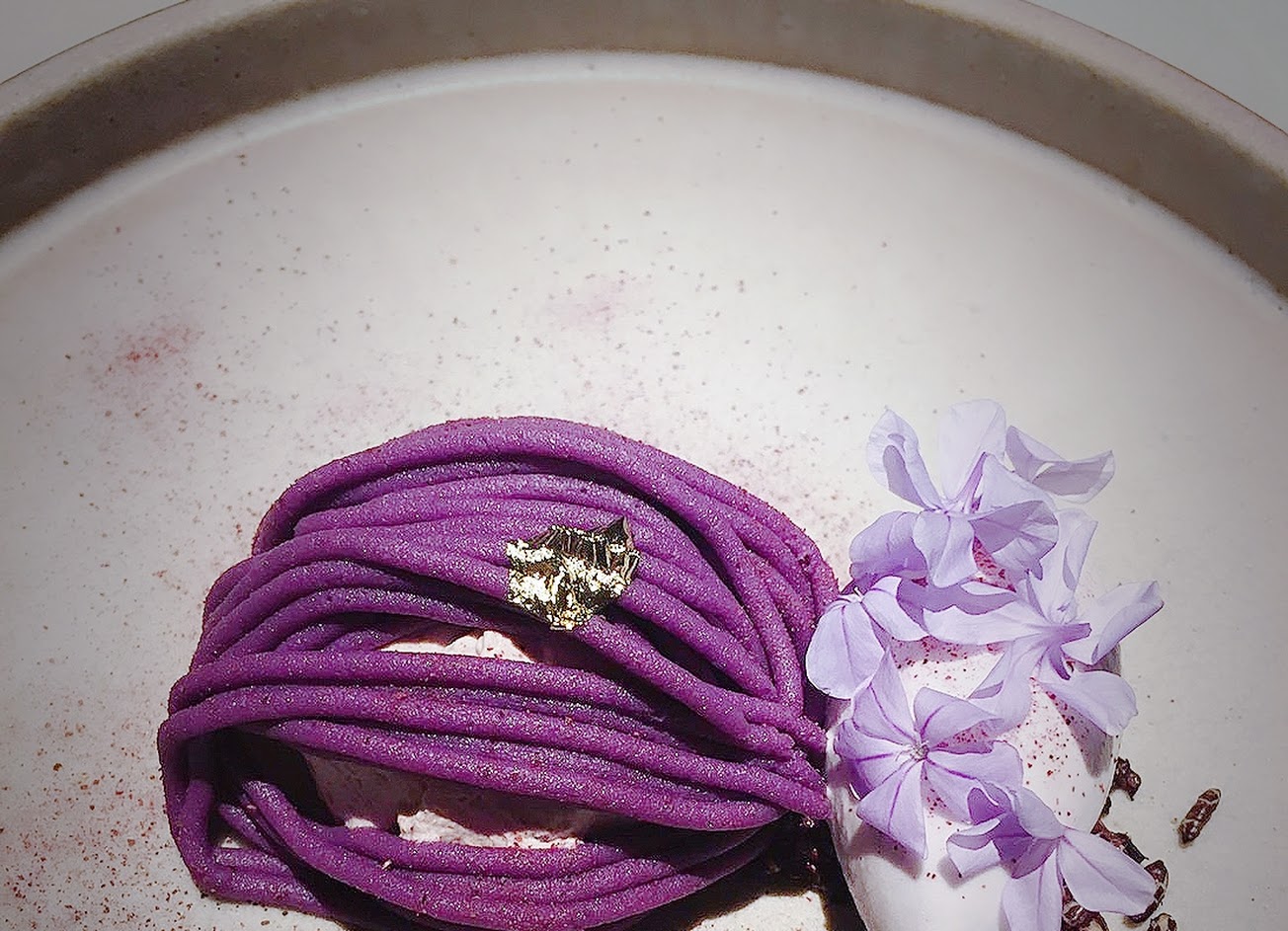 甜點:紫米地瓜和椰奶冰淇淋塊(液態氮)吃起來很柔和,搭配微酸的羅望子醬,好吃不甜膩。