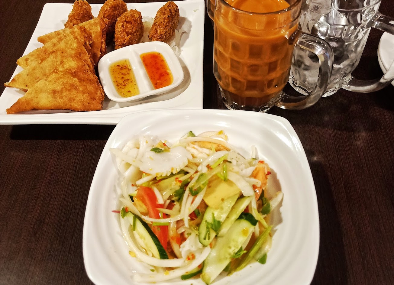 涼拌海鮮沙拉, 清蒸檸檬鱸魚, 打拋豬肉飯, 月亮金錢蝦餅雙拼