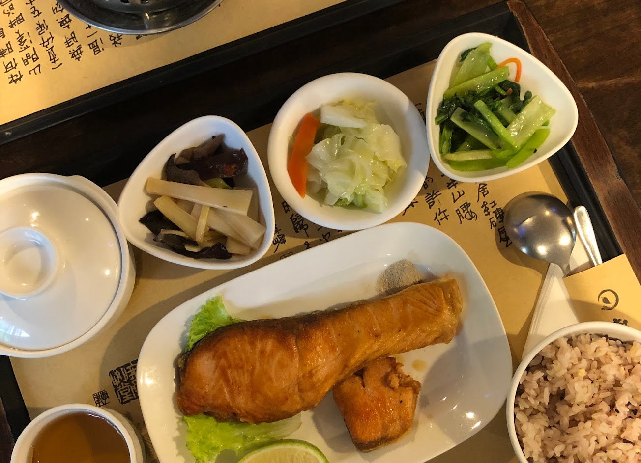 配菜都是冷的,牛腩普通、鮭魚有點老,但草仔粿好吃很香推薦,環境不錯可以拍照。