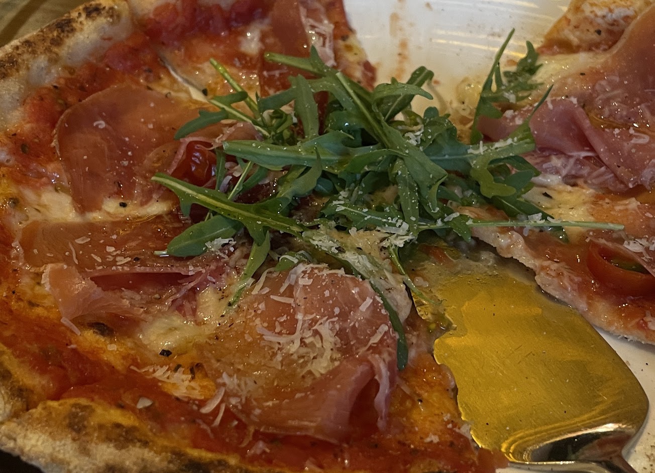 披薩是義式餅皮Q彈口感很好 可惜調味個人覺得口味不太協調 番茄醬的味道太搶戲 芝麻葉跟生火腿的味道被蓋過好可惜