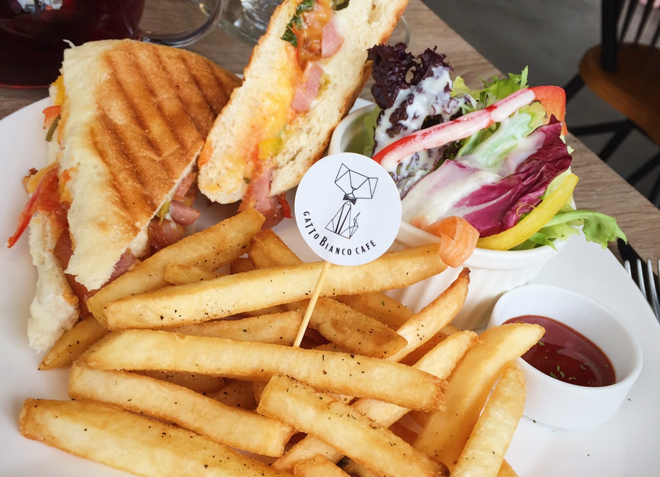 有停車位,位置在公園旁很方便。餐點選擇多、份量很大。沒有真的貓在點堂不過裝飾也蠻可愛的。點了一號餐(附圖)有炒蛋、沙律、捲餅、水果配搭應有盡有。