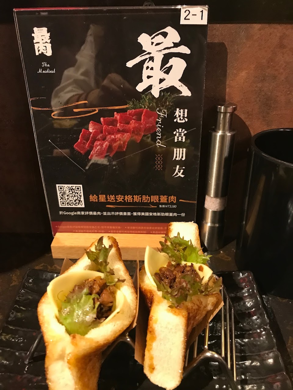一家王品集團下的精緻燒肉 裝潢非常有餐酒館風格的烤肉餐廳,酒的品項還不少,肉也相對比較高級一些,重點是”不需要自己動手烤”,完全由專屬的桌邊人員幫你烤肉跟服務,醬燒牛肉焦糖吐司 好吃!!雖然價格不便宜,但品質相當好。