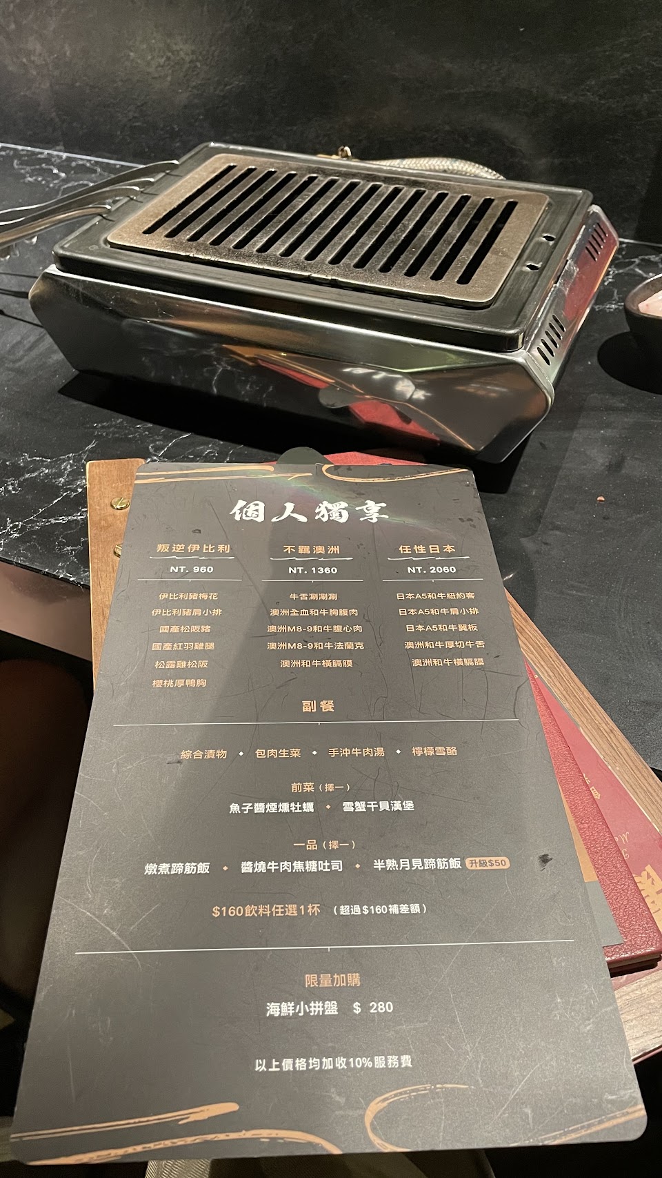 為了參加台中購物節特別跑下去台中吃,原本要吃屋馬,但身為王品忠實粉絲跟會員,一定要支持一下王品集團的餐廳,尤其是台北還吃不到?,餐廳裝潢的還不錯蠻有氣氛的,洗手間還有漱口水跟Jo Malone 的香水可以用?,男生的是LIME BASIL&MANDARIN 和BLACKBERRY&BAY,女生的是BLUEBELL跟另一種我忘了?,再來說說服務方面,全程代烤,不用像其他間燒肉那樣吃得手忙腳亂,可以優雅的慢慢拍照慢慢吃?,店員燒烤的功力一流,速度也掌握的恰到好處,聖誕最限定組合餐的柚子櫻花酒非常好喝,還有煙燻乳酪澳洲全血和牛也非常好吃,不過好像只到明年1/1的樣子?美國和牛牛小排還有仙氣,最適合手機拍照錄影用? ,生日送翼板牛肉杯雖然份量少但也是非常美,日本A5和牛拼盤,吃到後來都不知道在吃什麼部分的肉?,伊比利豬肩小排跟松露雞松板還有迷迭香澄酒櫻桃鴨胸也都不錯吃,這樣牛豬雞鴨全都有吃到了?,主食的剝皮辣椒牛釜飯要等20分鐘,份量就兩小碗,味道不錯但一下就吃完,醬燒牛肉焦糖吐司,甜甜鹹鹹的滋味真是令仁懷念,期待下次去把剩下沒點到的菜色補齊,是間會讓人還想再去光顧的好餐廳,推薦給各位?,也祝辛苦的代烤人員聖誕快樂?,平安喜樂每一天?