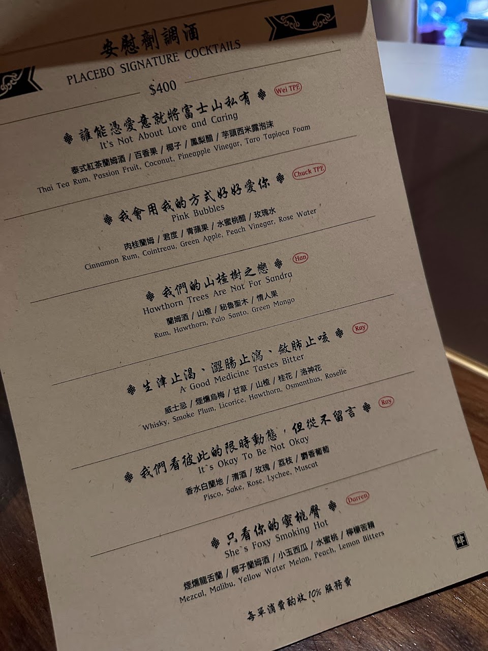 這是知名酒吧,安慰劑二店。 目前二店落腳在台中,主要由合夥人 陳戴倫 主持… 一如台北店風格,帶著略古典風格,空間也相較於台北店大了將近2倍有餘,所以相當更為舒適。