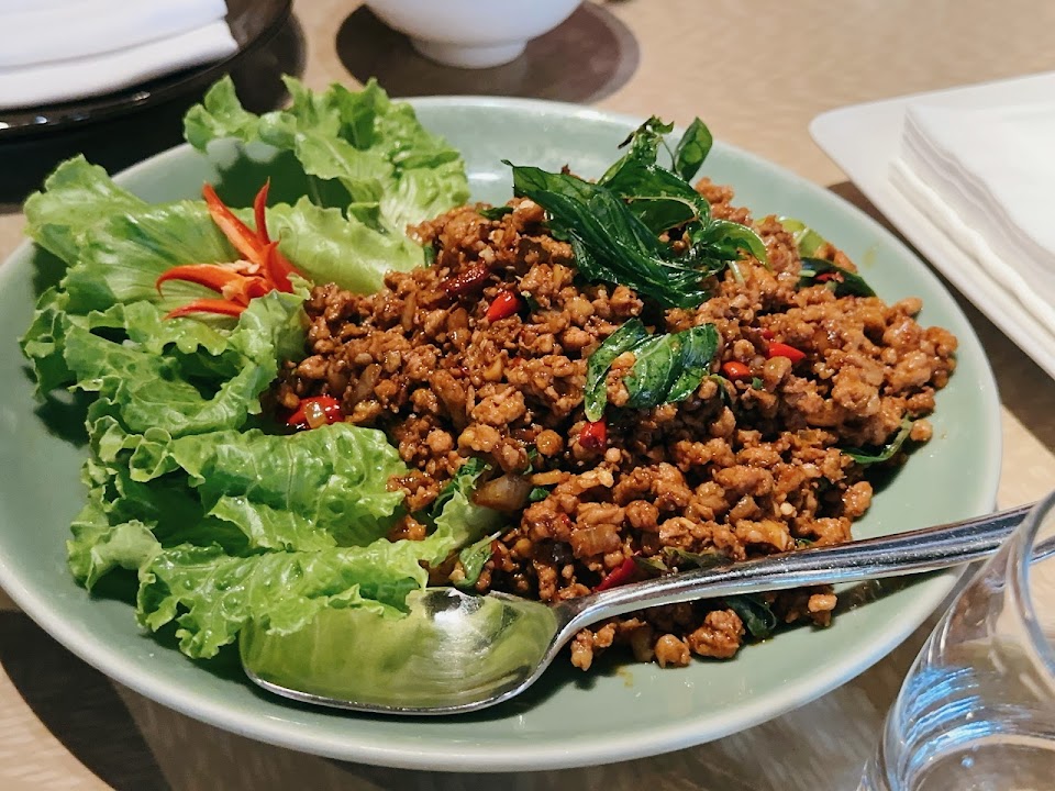 高價位的台版泰式料理,餐點精緻,口味獨到且美味,也不像多數的台版泰式料理吃完口乾舌燥。最令人驚豔的一道應該是馬沙曼咖喱牛腩(800元),咖哩層次感豐富,許多不同的香味互相襯托卻不互相掩蓋,牛腩肉質相當不錯,很值得推薦。其次是月亮蝦餅(580元),和其他家比多了將近一倍的厚實感。飯後甜點推薦香蘭芋花園(180元),有滿滿的芋香和米香,很特別。用餐環境明亮舒適,服務非常周到。我們四個男生一起去吃,一個人平均吃下來約1200元,值不值得就見仁見智。整體而言菜色美味且獨特,喜歡泰式料理且預算夠的話,相當值得一訪。