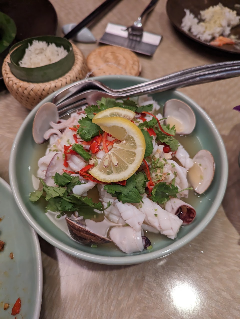 很厚的月亮蝦餅 酸辣拌海鮮 摩摩喳喳 泰式雞蛋糕 松阪豬頸肉