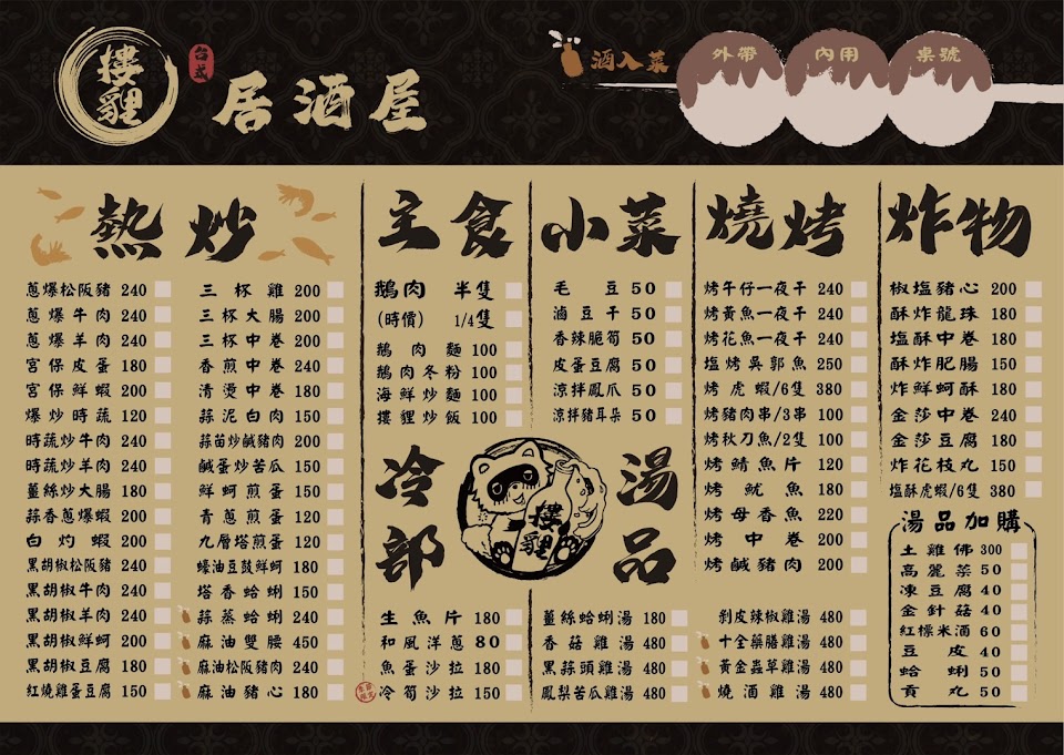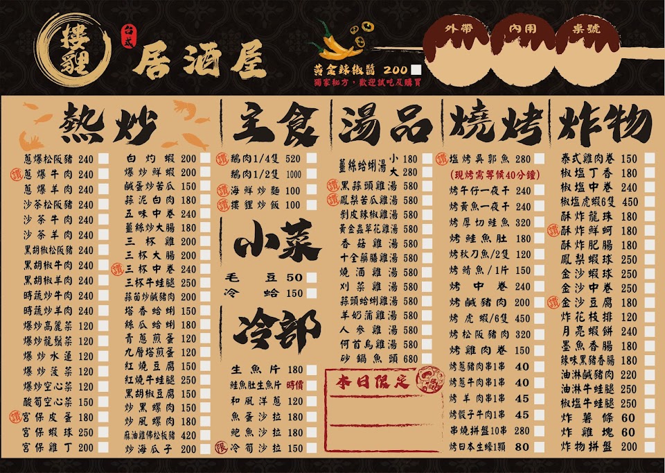2024最新在地推薦餐廳的菜單_摟貍台式居酒屋-沙鹿台式居酒屋|居酒屋推薦|鹽烤吳郭魚|熱門餐廳|人氣熱炒|在地推薦餐廳的菜單、圖片