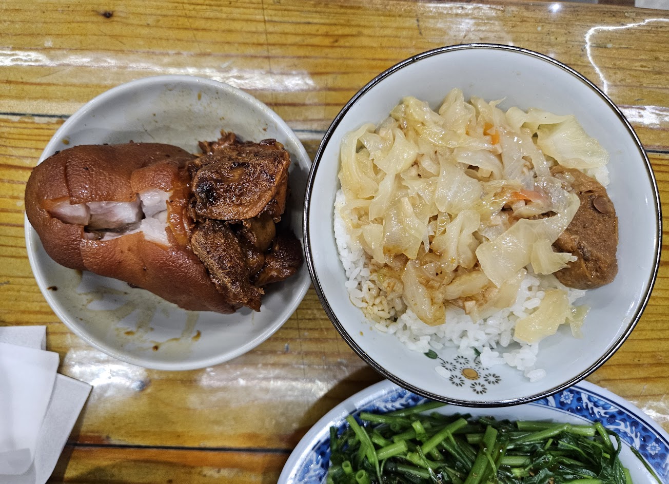 爌肉飯、腿仁飯、腳庫飯好吃,肉品配一個吸飽滷汁的麵輪,加上滷白菜,米飯也不錯吃,排骨飯的排骨,覺得一般。綜合湯CP值高。門口處有放免費的醃漬小菜,不管內用外帶很多人取用。