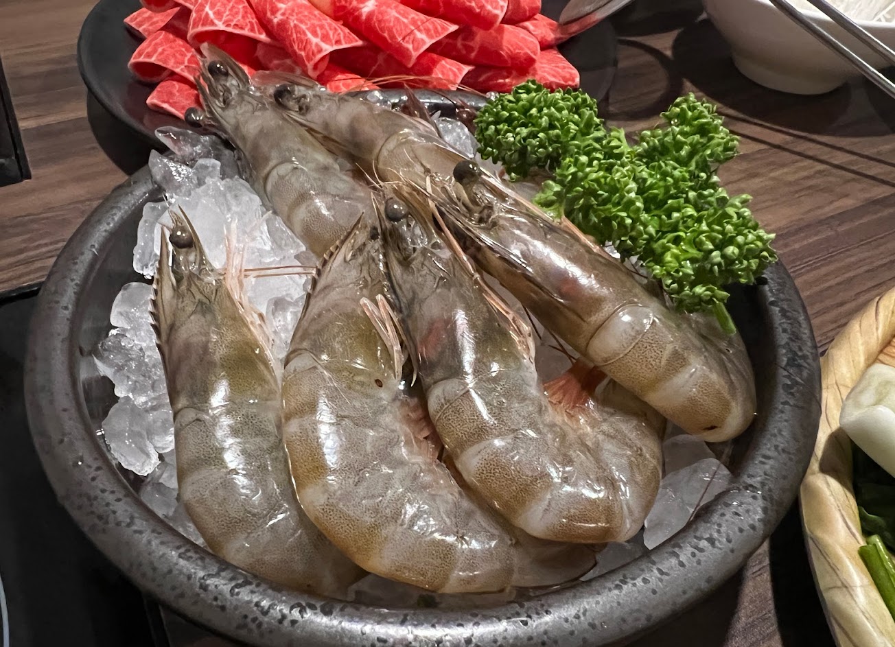 剛入座時被安排在一進門的第一桌,但沙鹿生態豐富,別的客人一推門居然有蟬飛進來,一頭撞到隔板再掉進我鍋裏?想想人家在土裡沉潛了七年,短短七日的蟬生就這樣不明不白的終結在一鍋熱湯?也是悲慘⋯⋯還好工作人員聞聲而至,幫我換了鍋子也換了位子,還建議我們應該去買樂透,畢竟這種事情不是常常有?