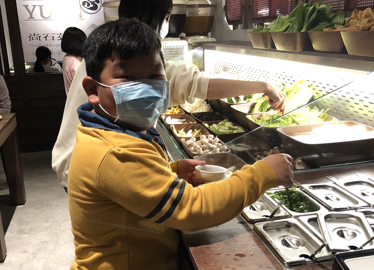 點完鍋物至櫃檯付款後,菜盤火鍋料皆自取,
