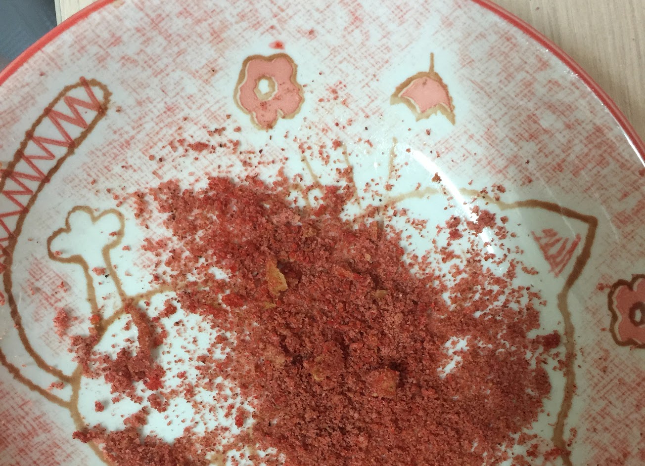 我點薯條加梅粉…有種被惡整的感覺? 整包薯條快被梅粉淹沒了…. 都倒到盤子上抖過了…還這麼紅 誇張死了!傻眼! 我點的其實是一包梅粉吧?