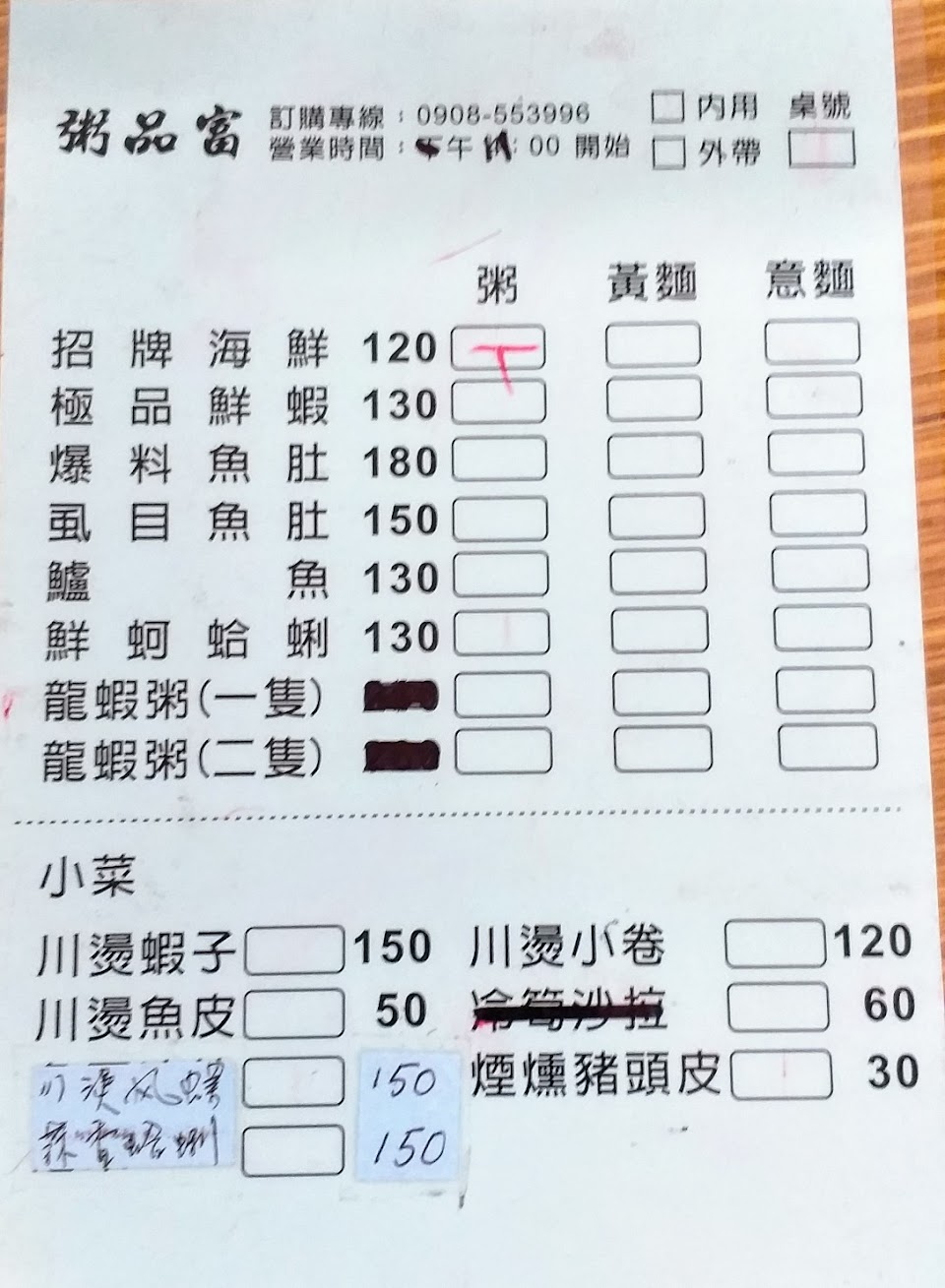 龍蝦粥改用波士頓龍蝦後購買過一次,分量很多夠兩個人吃,不過龍蝦鮮度不佳。因為波士頓龍蝦價高流動性低保鮮不易,知道店家會看,誠心建議停售這個品項。 —————————————————– 湯頭鮮甜海鮮新鮮料也給得很大方CP值很高,尤其是爆料系列料真的很多,湯也因此更加鮮美。但龍蝦是使用淡水螯蝦。除了粥之外也有意麵等可選擇,因為湯頭好每樣都好吃,就是選擇性少了點,尤其不想吃海鮮懶得剝蝦殼、想簡單吃個鍋燒意麵又不想屈就別家(?)的湯頭時……期待店家能多推出一些其他海鮮和非海鮮的相關產品。