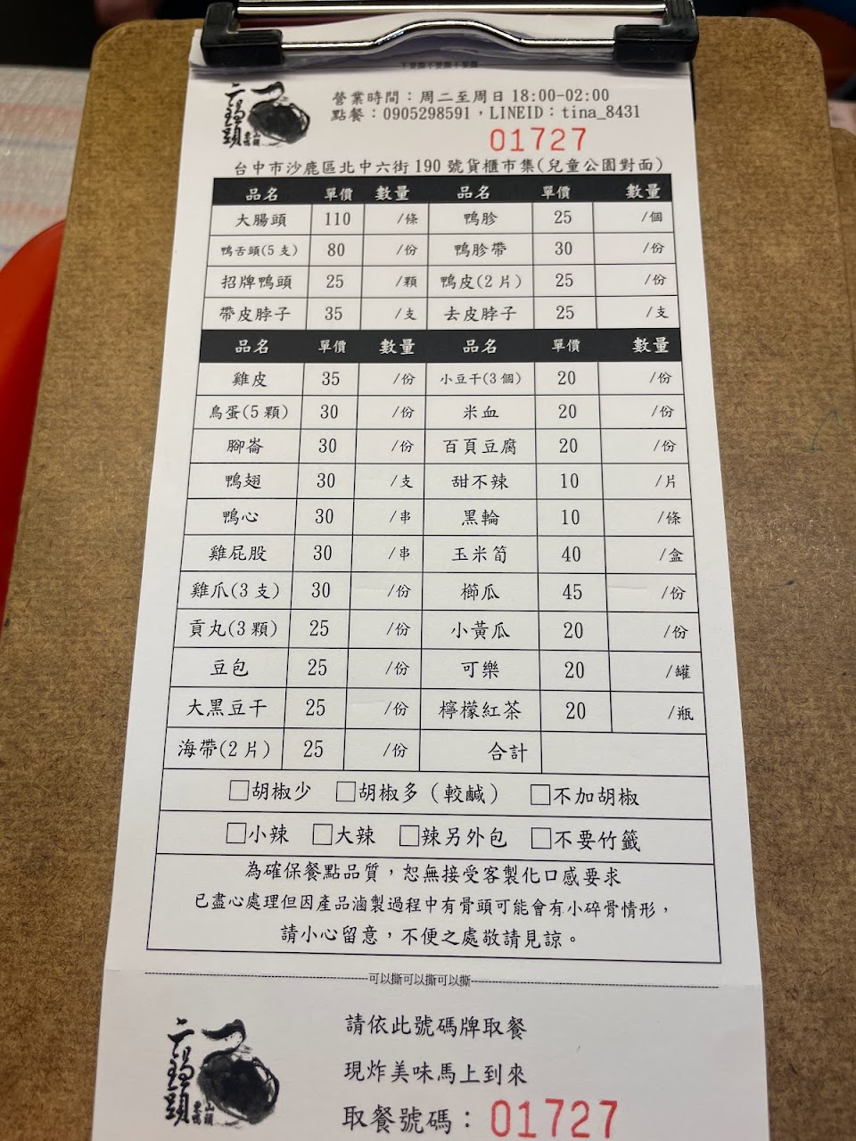 沙鹿算好吃的東山鴨頭,味道有入味偏甜,填單子後,老闆會自行夾取,選擇總類多樣,老闆態度也客氣,可以使用line pay