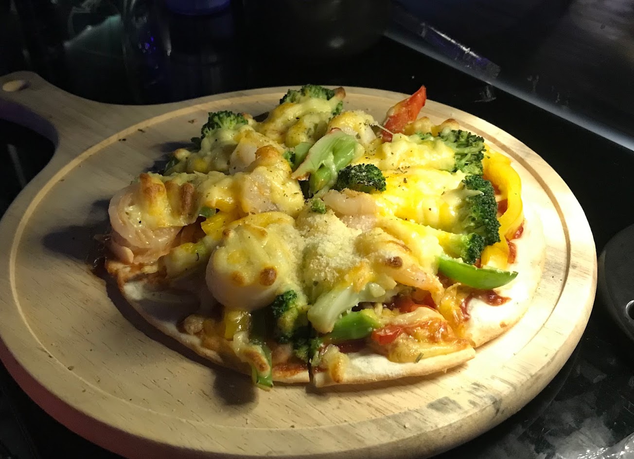 夜景很漂亮,餐廳環境很乾淨漂亮,服務人員態度很好,停車場很大,入口有坡底盤很低的車可能有點難進去,山路有點小。炸物拼盤放很多馬鈴薯,肉類比較少。披薩好吃。榛果拿鐵沒喝到榛果味道,焦糖拿鐵沒喝到焦糖甜味,冰拿鐵咖啡好喝。