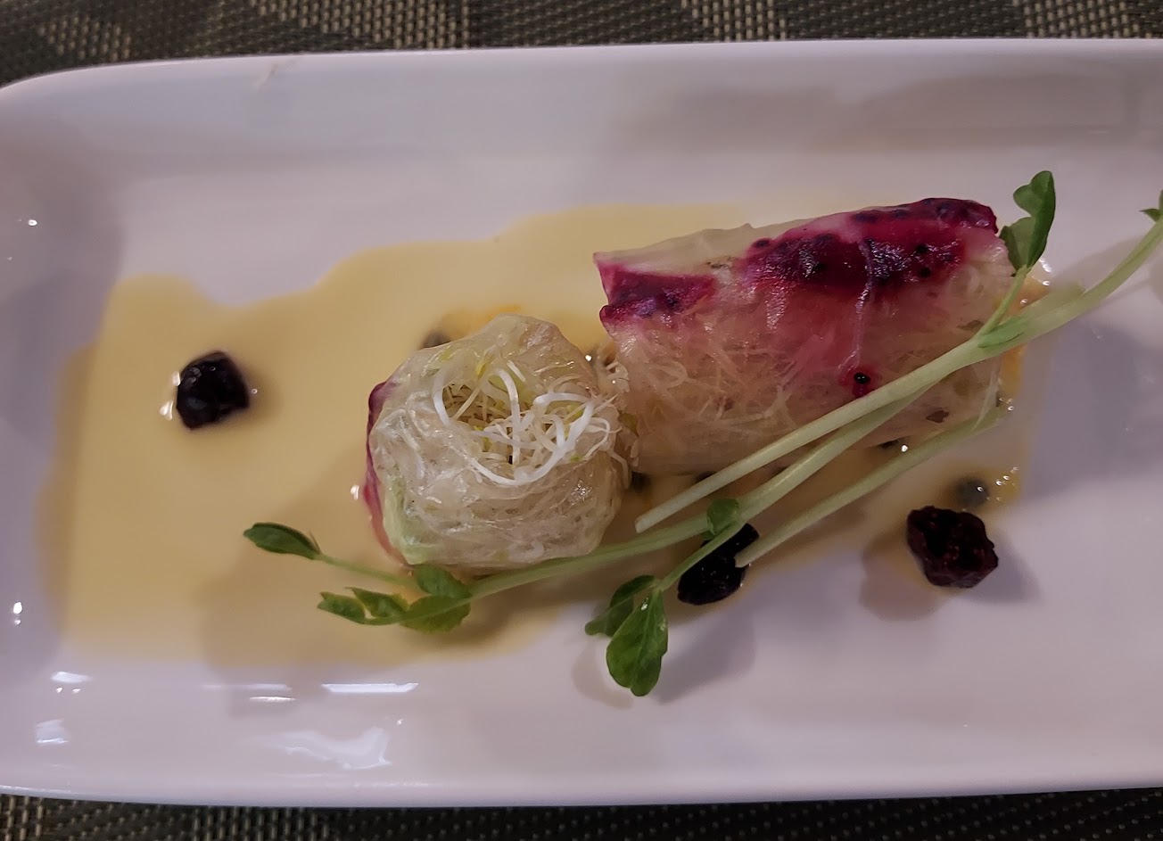 前菜的蘆筍沒有剔除粗梗,小米粥拼盤有苦味,單點榛果奶茶喝起來像沖太多水的三合一。另外,家人經過廚房時發現擺盤人員沒有配戴手套,直接用手拿取食物。