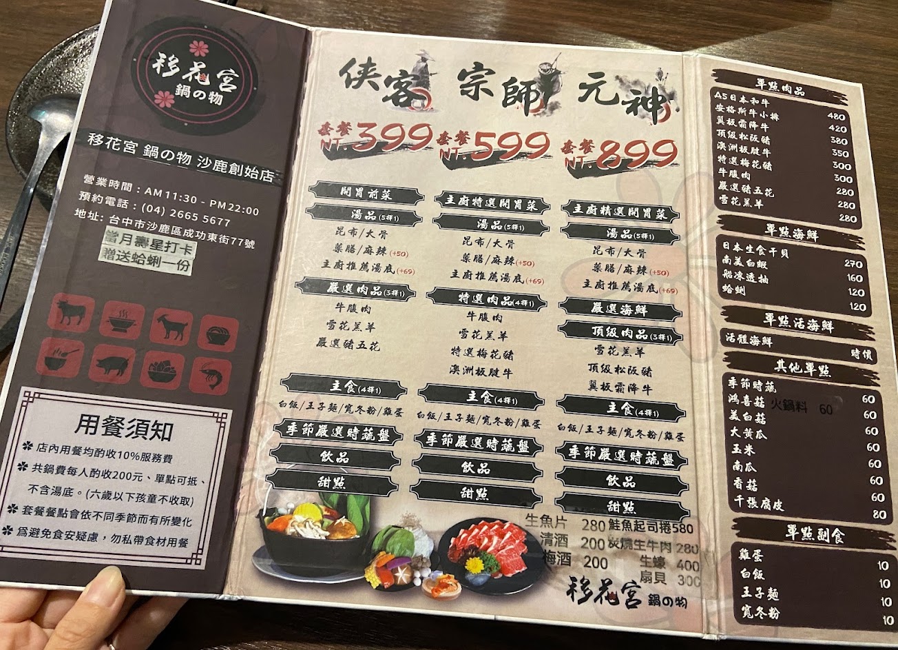 「移花宮」鍋物,聽起來是小說會出現的店名,有種古典又日式感,二話不說馬上帶著家人前往吃吃喝喝。 ◆移花宮專用停車場 一到現場發現有專用停車場,所以開車的我們實在太開心,不用花太多時間找位置。 ◆店內呈列 店內簡潔乾淨,面紙與牙線都在抽屜內,桌面也有小垃圾桶,醬料飲料區也都定時擦拭很衛生。 ◆套餐選擇簡單易懂 一共有三種套餐可以選擇,選擇簡單方便,詢問了店員小姐姐發現除了主餐不同之外,連開胃菜也略有不同,但都很日式且好吃,小姐姐說菜品會依照季節調整。 由於家人食量小,所以選宗師套餐(599元)+共鍋(200元→可折抵單點消費)。 ◆開胃菜─塘揚炸雞 師傅現點現炸,皮薄肉多汁,還附有手做沾醬一起搭配,會一口接著一口地吃阿! ◆湯品─大骨湯 跟家人共鍋,所以選擇安全牌的大骨湯,端上桌時香氣濃郁。小姐姐說是主廚早上用新鮮食材現場燉煮,難怪喝起來就是鮮美。 ※小姐姐推薦下次可以選擇藥膳湯底,不像一般的深色,而是清澈的顏色但是香氣四溢((筆記。 ◆肉品─澳洲板腱牛 主廚刀工很好,而且一片一片放在盤子上的時候就很乾淨漂亮,放入火鍋中一下下就可以吃了,真的很軟Q,味道鮮美,原本小鳥胃的家人也很喜歡,一口接一口吃,有多少可以吃多少。 ◆主食─王子麵 其實是因為家人愛吃王子麵,所以點來吃吃看,加入鍋中馬上吸收牛肉的鮮甜。所以王子麵也吃光光阿。 ◆共鍋200元─折抵日本干貝(270元-200元=再補70元) 日本新鮮干貝是大顆的,但忘記拍了覺得可惜,下鍋煮熟馬上撈起來,新鮮好吃耶。 ◆季節嚴選時蔬盤 內容有基本的高麗菜、香菇、爆漿小丸子、紅白蘿蔔們等,會隨著季節進行調整。 ◆飲品與甜點 飲品可以自行取用,是冬瓜檸檬,不會太冰之外,濃度跟甜度也足夠!超像飲料店賣的啦~ 甜點是烤布蕾,原本以為已經很飽沒有位置可以放甜點了,但一看到烤布蕾出現的時候馬上食指大動,脆脆的表皮甜甜軟軟的烤布蕾,真的很適合吃完火鍋來上一顆,覺得滿足! ◆小小心得 小姐姐說師傅們對於食材很要求,所以每道都很用心準備,我與家人也覺得整體吃起來非常新鮮甘甜,小姐姐們的服務親切,有問題都可以找他們,會繼續再訪的。