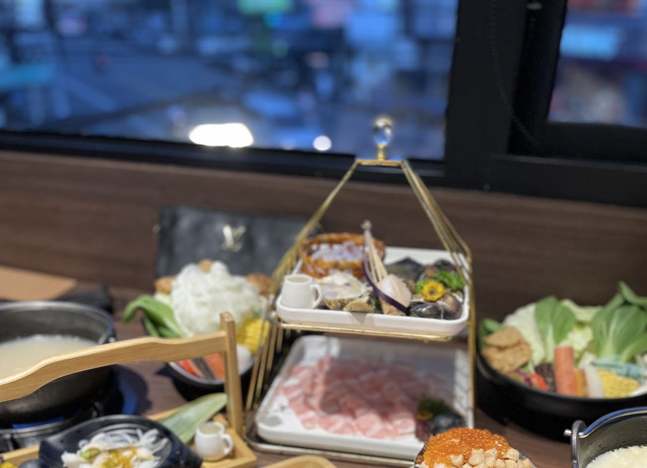 連一顆星都不想給,千萬別看評分高就來吃(打卡送蛤蜊),這只是一間吸睛的網美火鍋店,cp值超極低,899的套餐,前菜鮭魚握壽司…小小的,海鮮拼盤份量很少,只有透抽是很新鮮,其他都不是很新鮮,菜盤也很簡單,主餐~翼板霜降牛~普普通通,加購的干貝鮭魚卵飯(199元),也是小小的一碗,小干貝口感鹹甜鹹甜,整體出餐沒完整性,菜盤都吃完了,899主餐卻一直沒給,好不容易上來了,鍋子裡的湯已見底(在剩半鍋湯以前就說要加湯了),結果加湯也是還要再等,總之,個人認為,花899加一成服務費,寧可在台中市區吃高檔的火鍋,也不願意再到這家店花費⋯⋯
