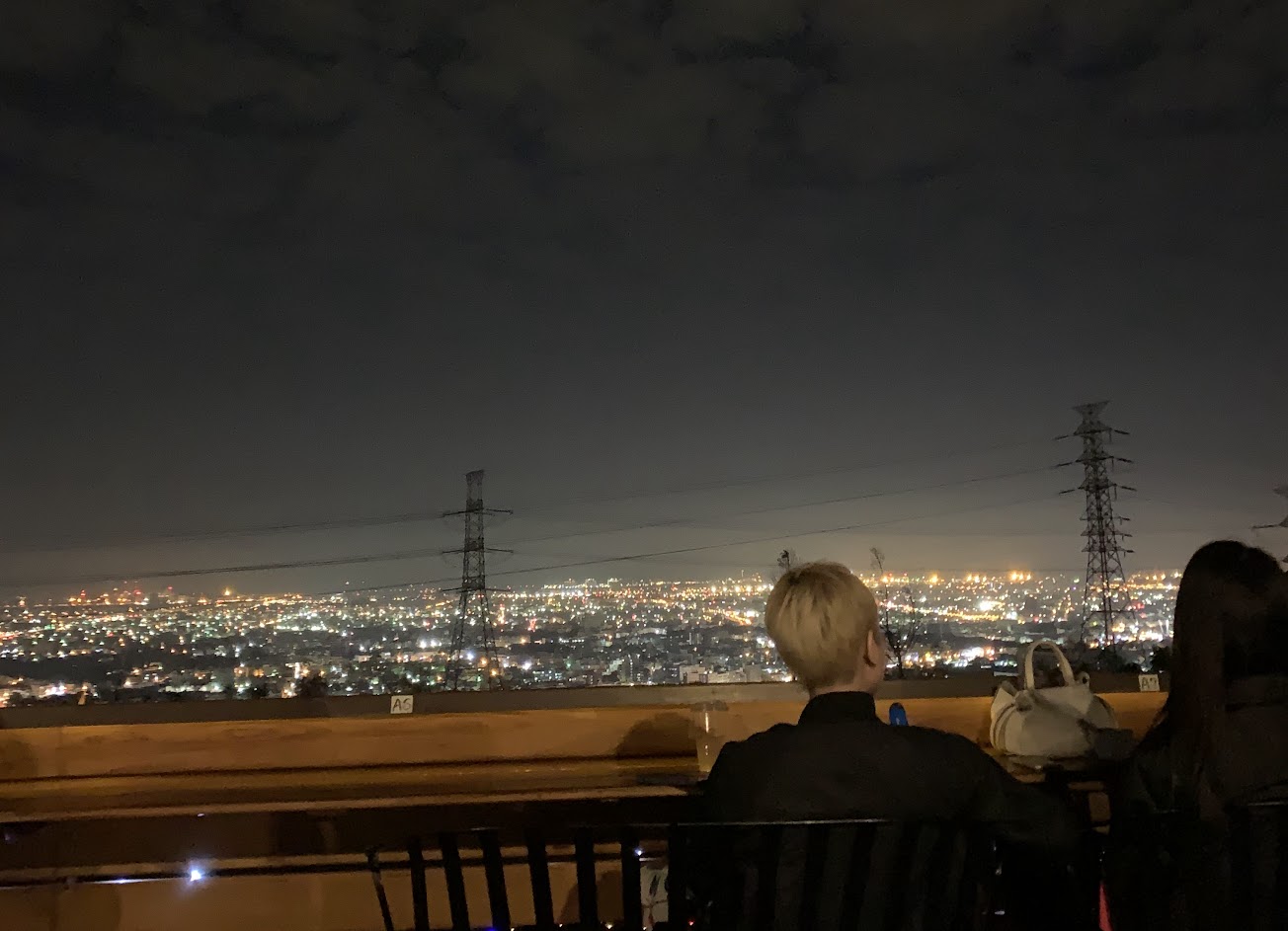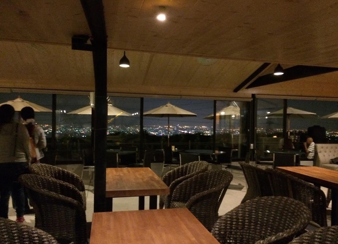 位置非常多,有室內也有室外,室內座位舒適但看不太到夜景,只看得到人工掛燈閃閃閃;室外的部分氣氛不錯,只是景觀中會先看到一片停車場,然後最顯眼就是好幾支高壓電塔,才有一排夜景,老實說不如預期