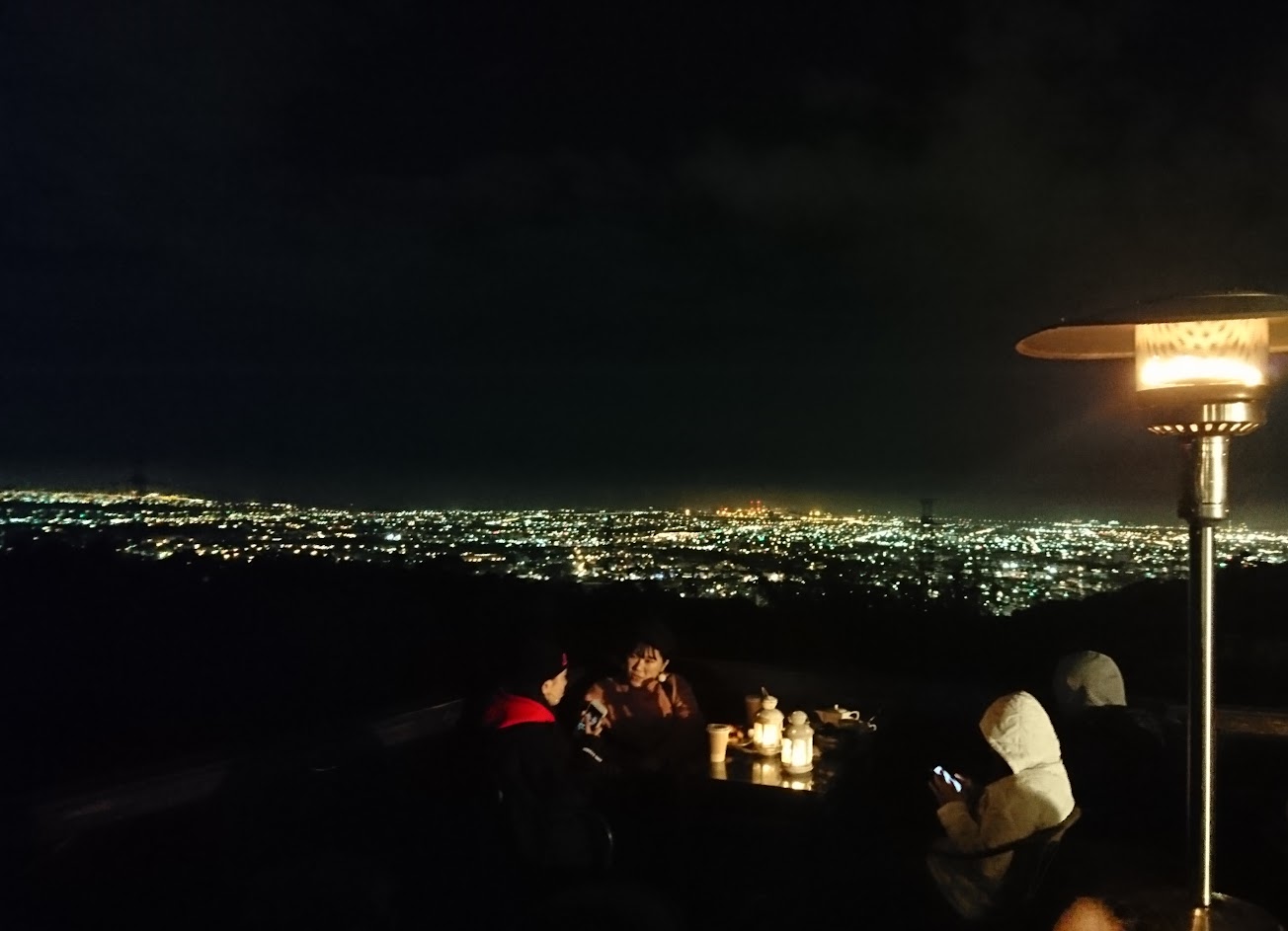 上山只要三五分鐘的車程,是看夜景聊天的好地方,但因爲是戶外座位所以旁邊的客人可能會抽菸