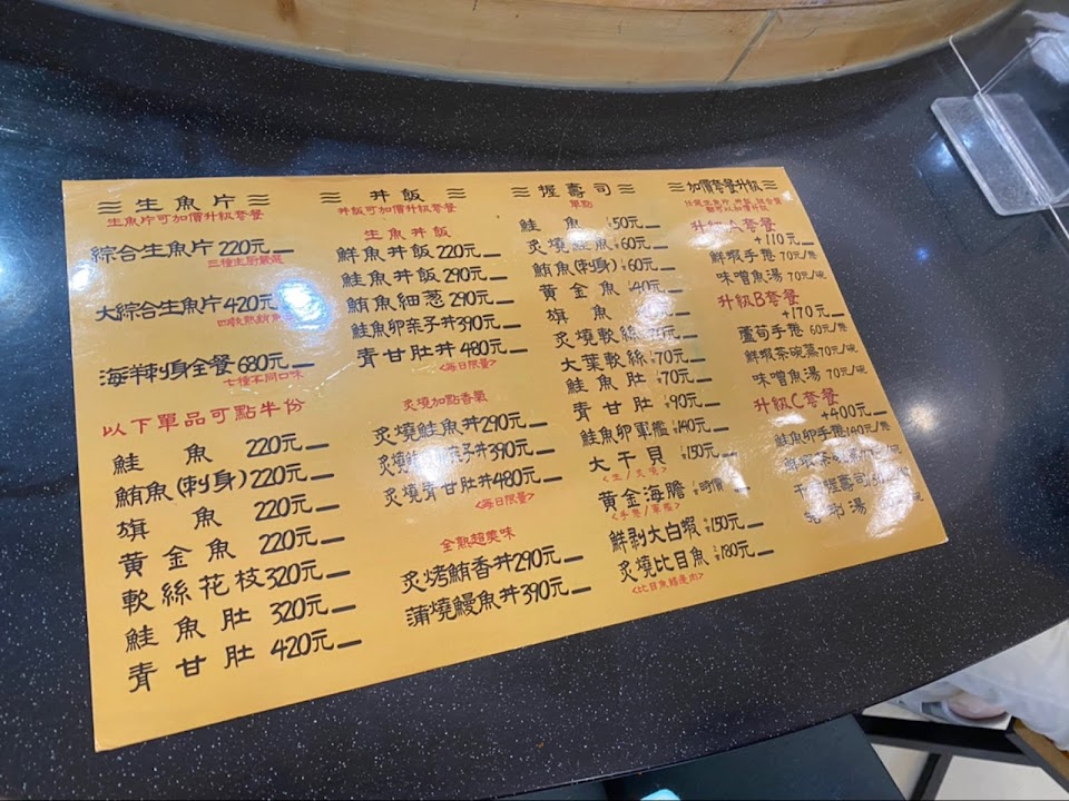 點了420元的組合餐,有兩貫鮭魚握壽司,兩貫黃金魚(?)握壽司,綜合花壽司八顆,不知所云的時候杯子丼四顆。是不貴但真的是不怎麼好吃,爭鮮都比較強。 加點套餐170元,有蘆筍手卷,中規中矩;茶碗蒸,用塑膠碗蒸的,上面蝦子還是冷的;鮮魚味噌湯蠻好喝的。 另外加點兩貫鮪魚握壽司,非常台式的口味。也沒有附上薑片,芥末。