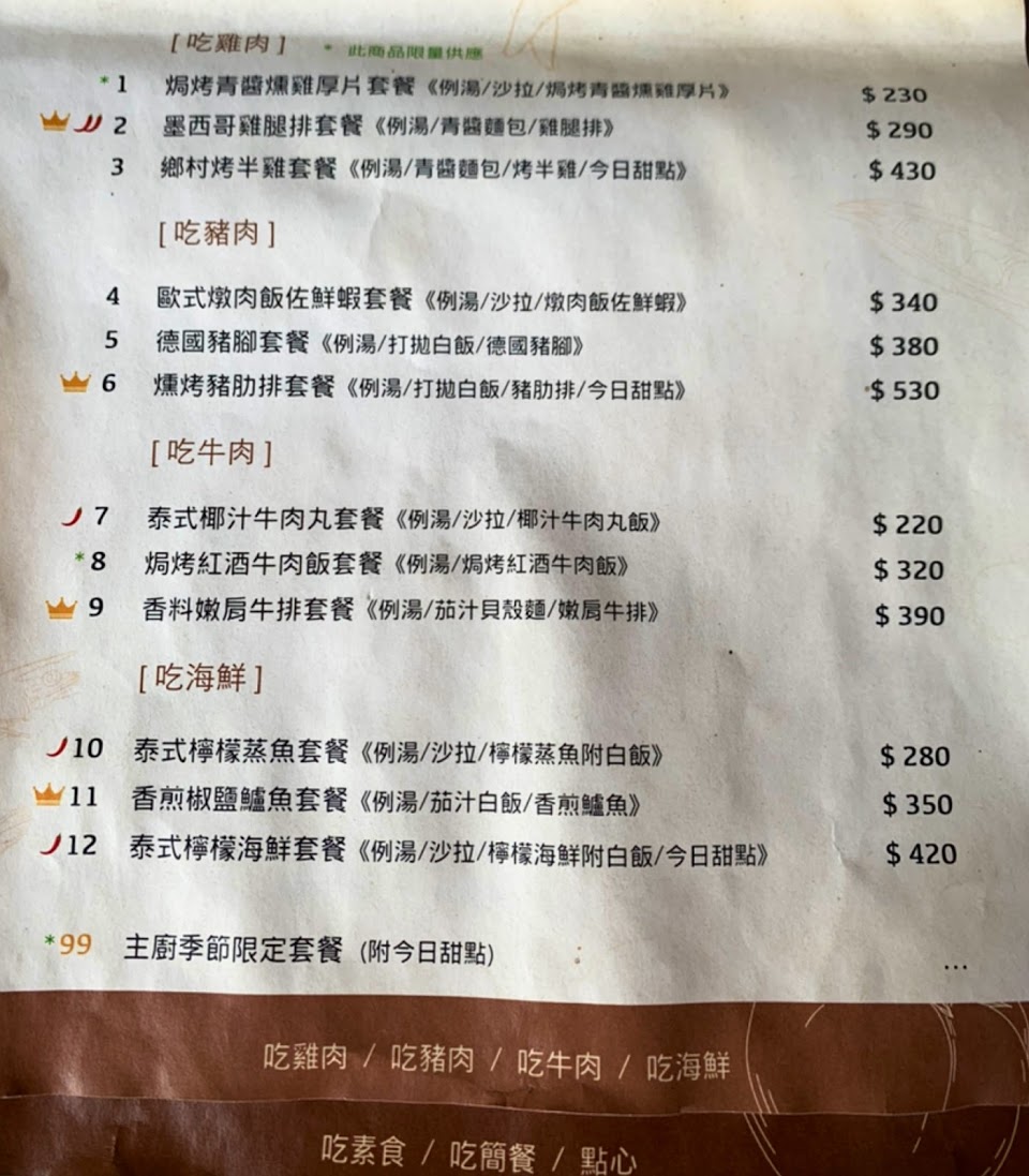 四人套餐份每道餐點份量少,四人絕對吃不飽,雞排、豬排、牛排均薄薄且小小一塊,牛排筋多肉如象皮筋,飲料無味如飲白開水,吝於給客人加餐具、餐點也無幫客不分切,卻要收服務費,整體而言,在清水區的消費水平算中高,食物與服務CP值不高,不會有再去的衝動。