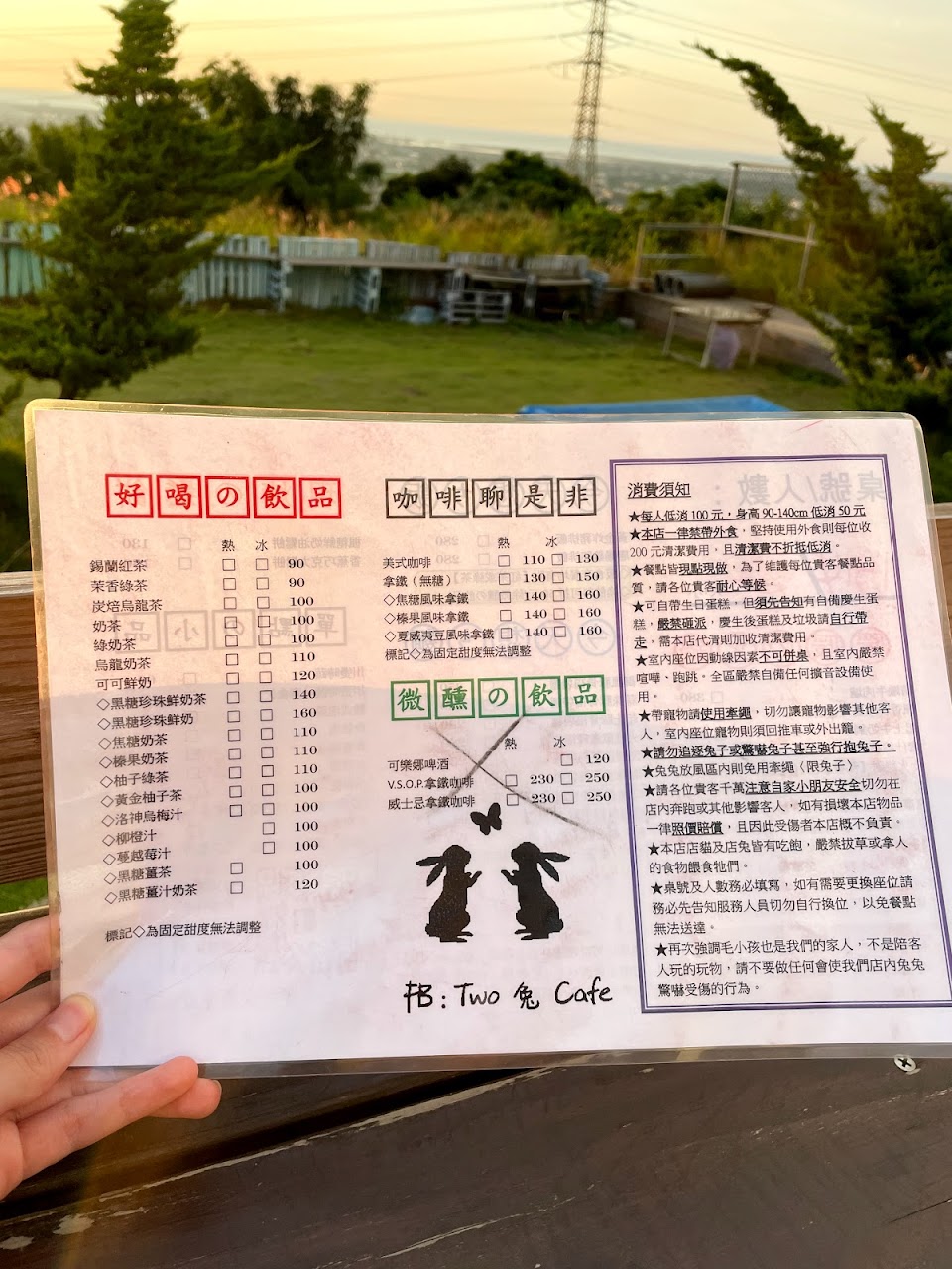 座位不多,多為戶外,但環境簡單舒服,有草地還有躺椅,看夜景很悠閒,還有店兔很可愛。