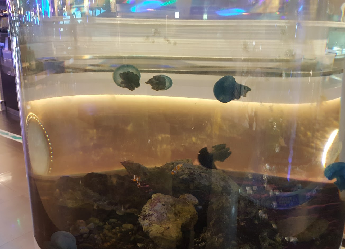 但是大/主水族箱裏已經沒有幾條魚了,非常可惜,我一年多以前來的時候,各色魚類相當的多,五顏六色的,加上燈光配合非常好看. 但這次再停下來休息時,就有點失望了。