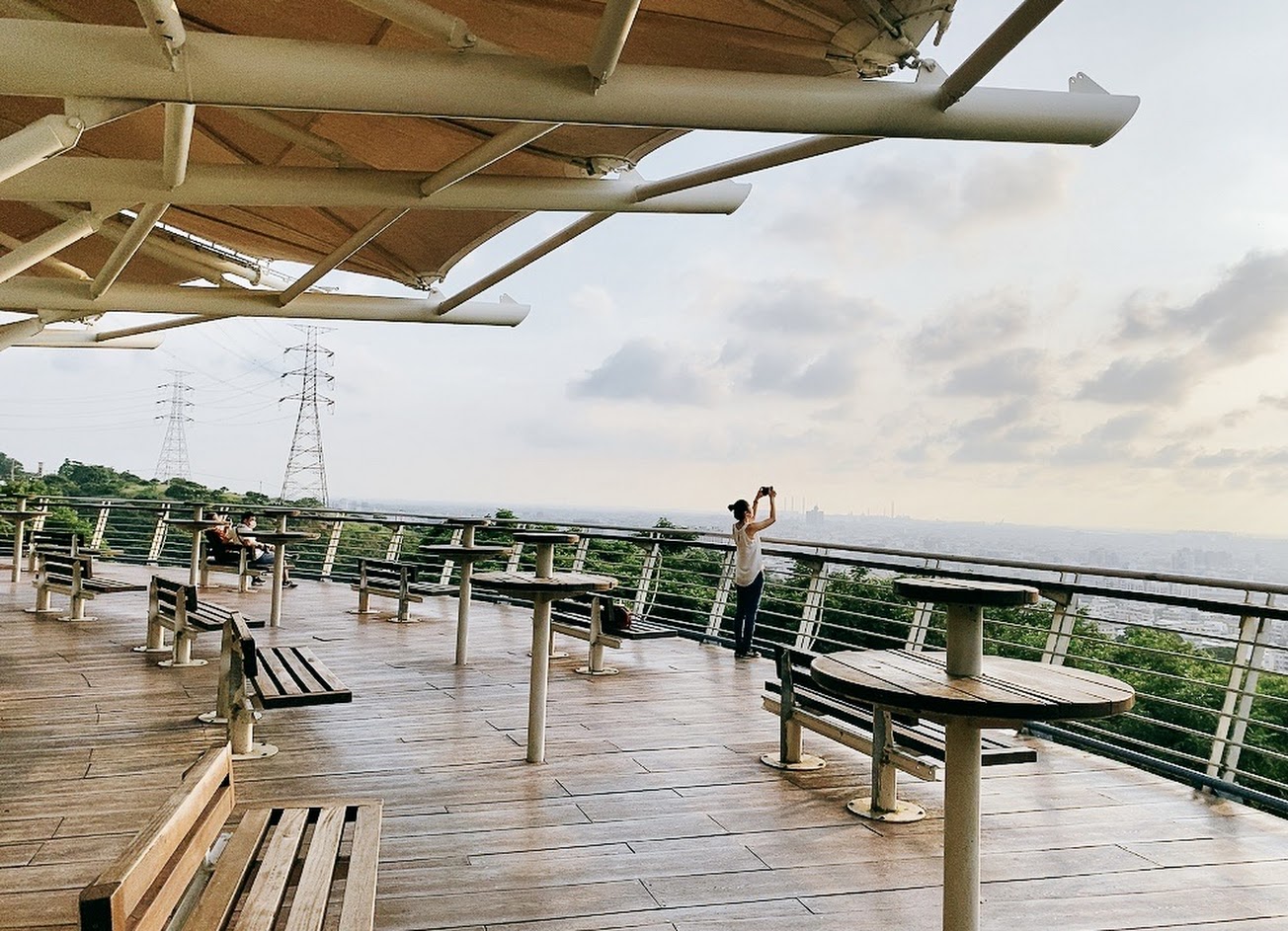 「鰲峰山觀景平台」總共有一大一小的觀景空間,一個是爬上坡先會看到的圓形平台,中間還有座白色涼亭,另一個是擁有180 展望視野的半弧形平台,不僅有許多可以休憩的座椅,中間還設置高腳桌,就像咖啡廰的吧台,買杯飲料來喝,邊聊天邊賞景相當愜意喔!