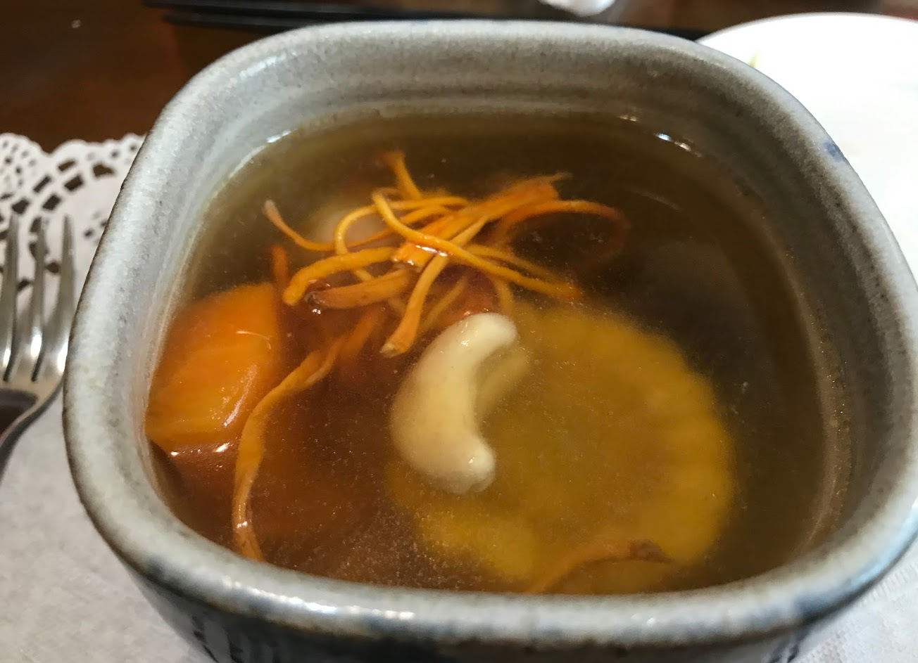 自製蛋豆腐口感偏彈,搭配干貝和佐料的味道剛剛好;醃香魚十分入味,下筷可以發現魚皮滲出點點醃汁,搭配絲絲梅汁牛蒡讓人一口接一口,魚骨頭已經醃到輕鬆就能除去;燜鴨肉簡直無懈可擊,才夾起骨頭時肉就慢慢剝落了,肉質更是軟嫩多汁;芝麻蒟蒻條搭配杏包菇切條口感軟中帶彈;第一次喝無花果湯非常驚艷,湯頭自然香甜;菜間甜點是桂花蜜芋頭,口感鬆軟綿密,搭配桂花食用非常順口又多一層滋味。
