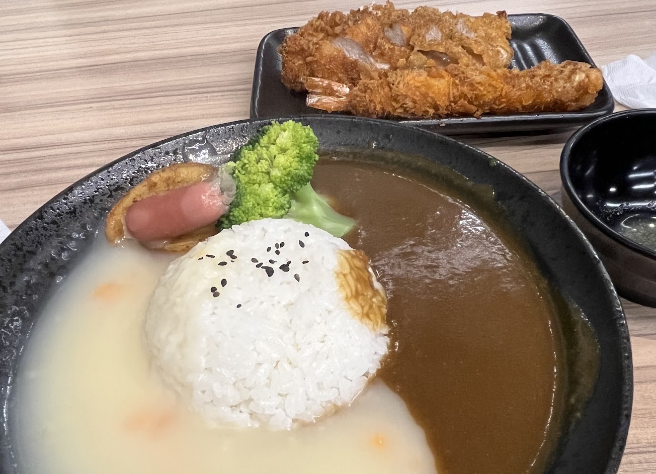 其實個人比較偏向4.5顆星,此間口味偏甜且淡些,主餐會用額外的盤子盛裝這點不錯,可以吃到原味或沾醬自行挑選,除了免費可加飯加咖哩一次外、還有味噌湯免費喝,配上百來元的價格,可以說是吃粗飽的選擇之一。店內飲料的話Cp值來說個人稍嫌不夠,不過其他炸物都有其價值,適合口味偏淡、胃口稍大的好選擇。
