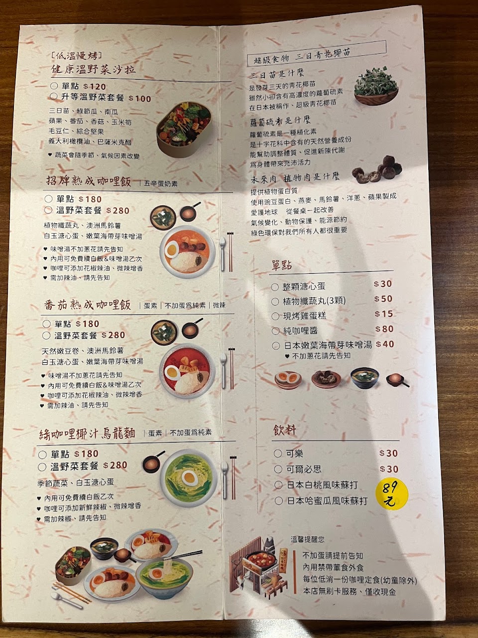 老闆娘的服務態度親切有禮,不論是綠咖哩烏龍麵,或者是招牌咖哩飯,溫野菜沙拉,以及內用才有的現烤雞蛋糕,都是值得推薦的好料理,每次吃完,身體都是溫暖舒暢的。