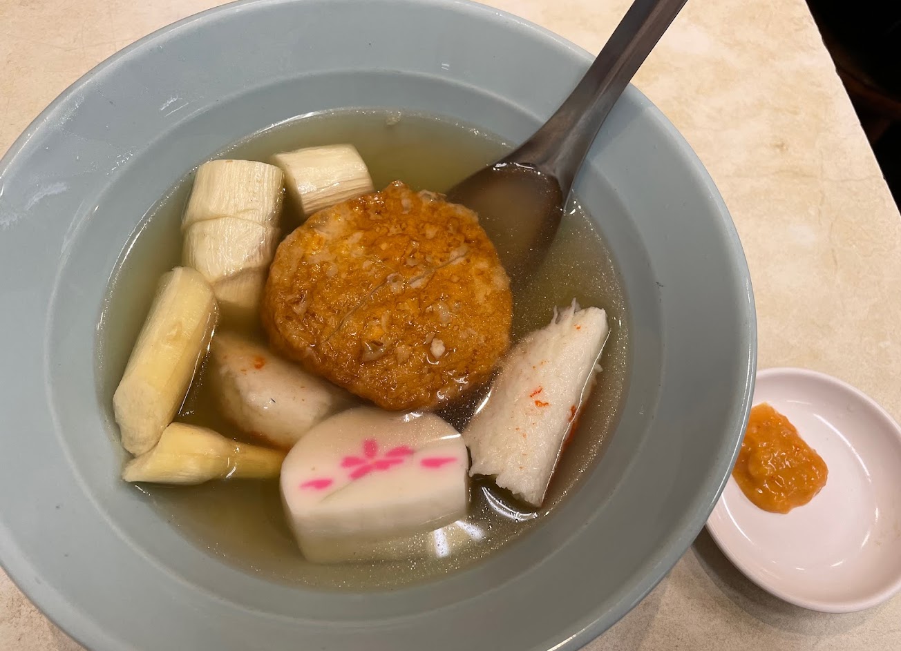 柴魚高湯?超香,湯很清,還有大尺寸蟹味棒跟整塊魚板!魚板咬下去超有彈性,跟平時吃切片完全不同東西,整碗食材連湯都很清甜,喜重口味的友人覺得沒味道,但他也是被整碗玉米嚇。份量都很大,因清爽吃多也不覺負擔,當然價格也比較高點。