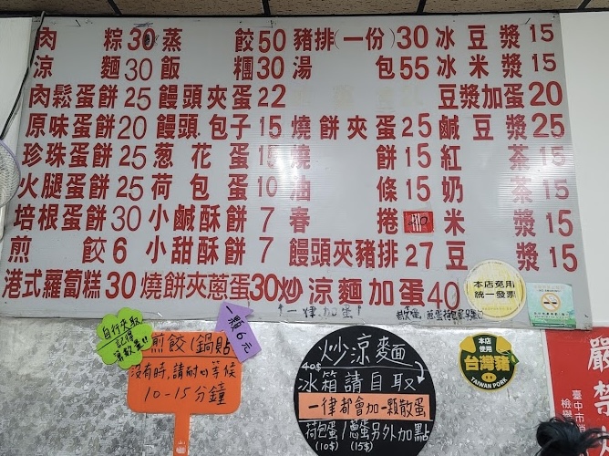 這家是豐原老字號的早餐店,店家是從宵夜場開到早上,很多人都喜歡這裡的煎餃,煎餃是店家自己包的,這裡的選項很多價格還蠻平易近人的,除了可外帶也可內用,半夜如肚子餓想吃東西可來這嚐嚐。