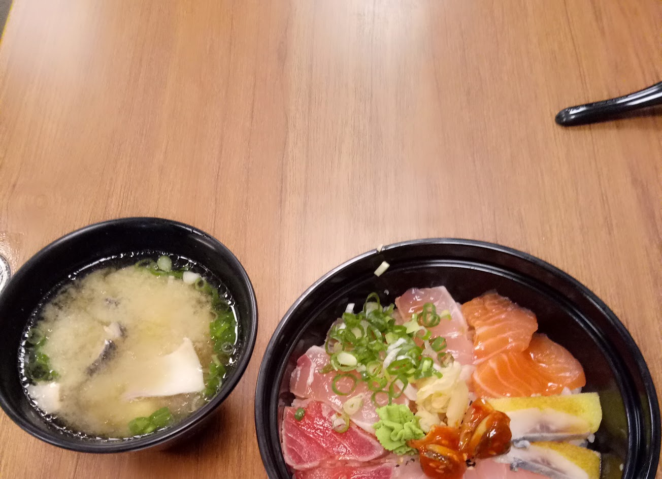 牛肉蓋飯和生魚片都還不錯吃,但唯獨芥醬末嗆辣了一點,有比較濃的化學味,食用前要斟酌一下用量,個人覺得還可以接受。