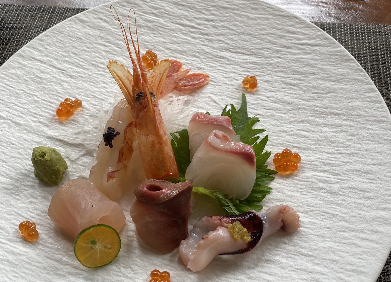 入口處像是民宅,頗有私人招待所的感覺,庭園造景幽靜,遠離塵囂,還能看到無光害的夜空,非常適合晚餐前往。餐點新鮮精緻,吧台處有陳列日本酒,可惜當晚開車無緣品嚐。美中不足的是服務小姐太親切熱情,問的問題差點害人大暴死……