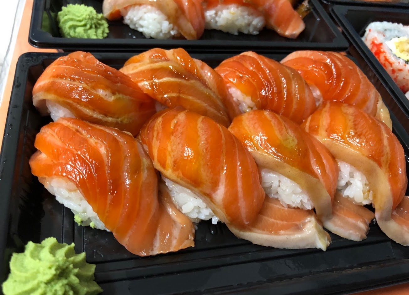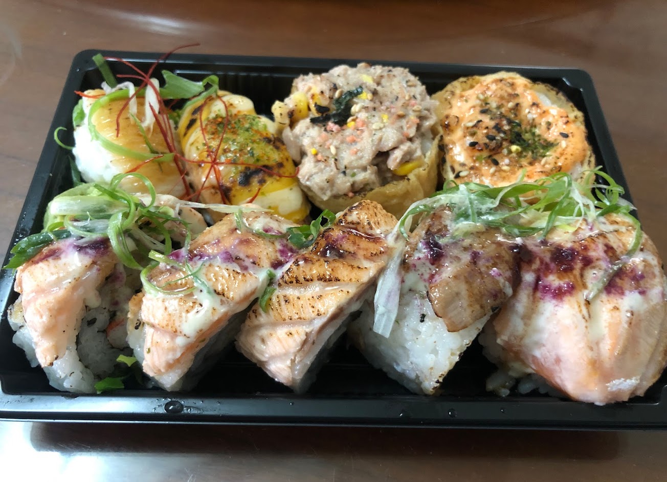 第一次外帶五種口味的捲壽司,竟然每種都好吃,因為現點現作炸蝦捲回到家吃還很酥脆,尤其是蝦尾很酥很脆; 鮭魚捲有炙燒過,多了一股香氣,是我喜歡的味道; 鰻魚捲烤過的醬汁,剛剛好不太甜不太鹹; 花壽司與海苔壽司也好吃,壽司米很香Q。另外點的焦糖鮭魚壽司香氣十足入口即化,家人和我都超愛。