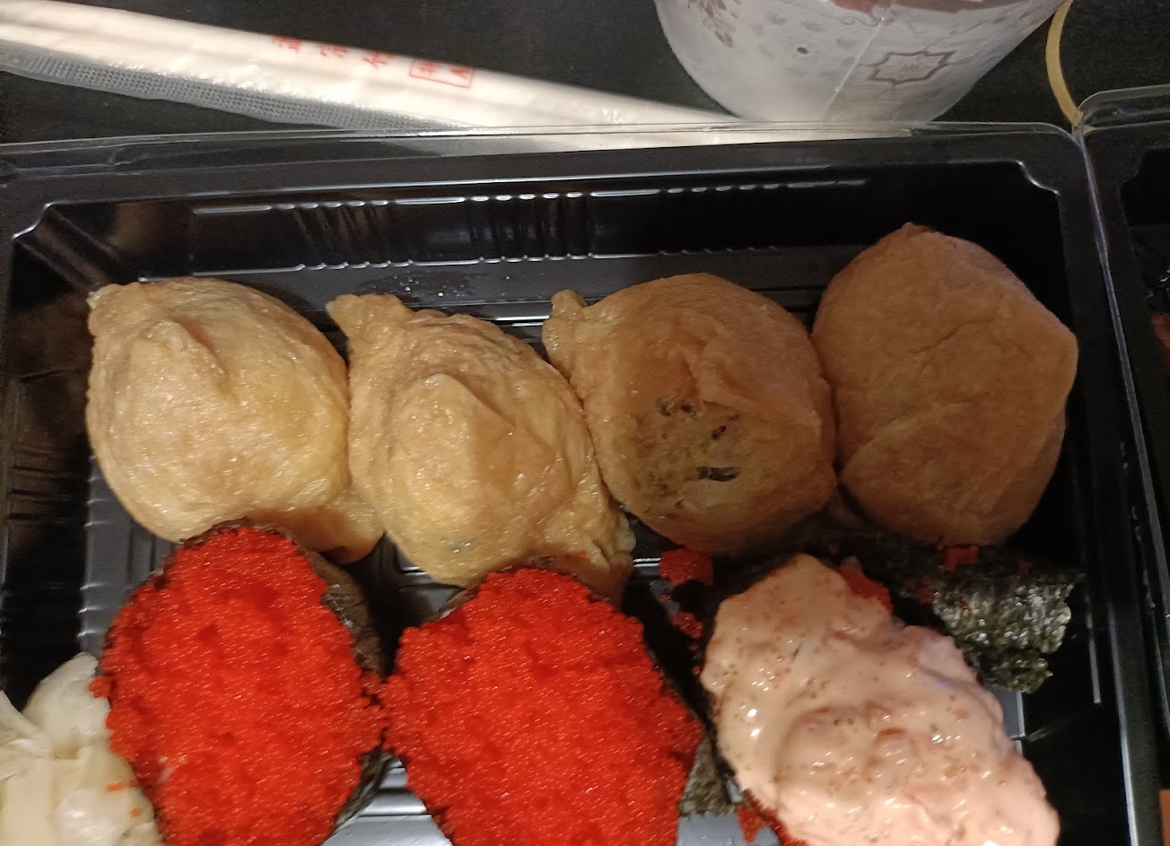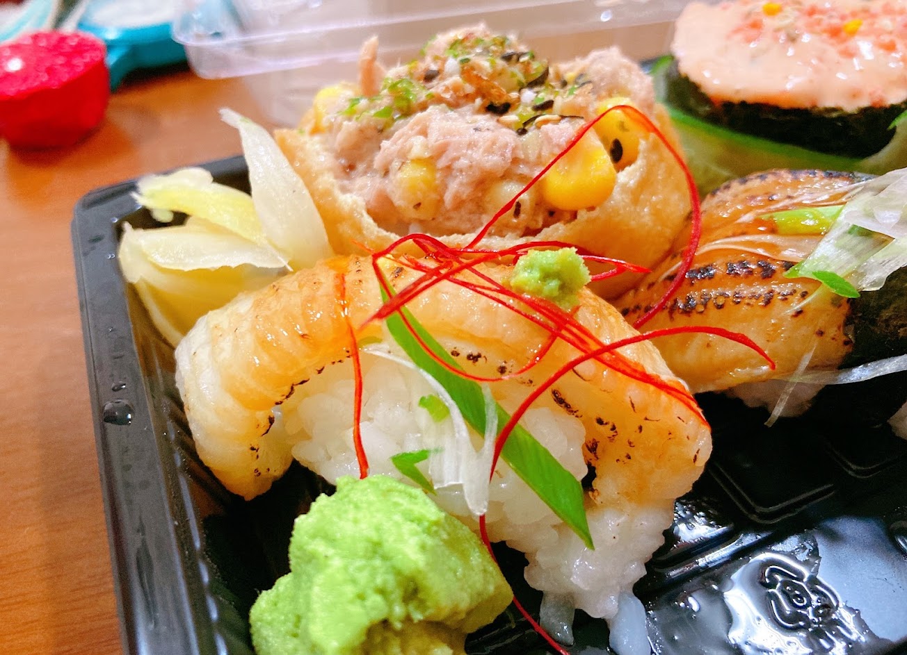 今天點了炙燒鮭魚壽司很香很好吃,份量上也很滿足。稻荷壽司的料也是很滿很紮實,口味也不錯。