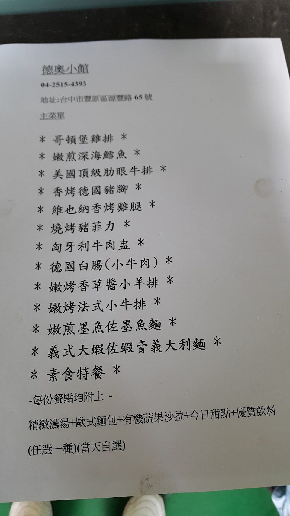 豐原在地二十年的歐式餐廳,位在市區街旁卻顯得沉靜低調,德奧小館主打特色異國料理、排餐跟義大利麵,室內充滿歐風的用餐環境相當寬敞舒適,很適合家庭聚餐或朋友聚會,餐點皆為現點現做,有酌收10%服務費
